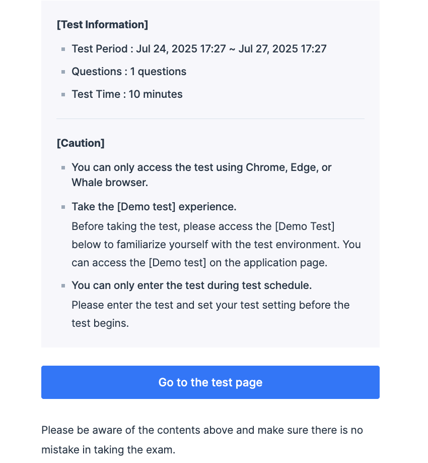 • By clicking the Go to Test Page button in the invitation email, test takers will be directed to the test screen.