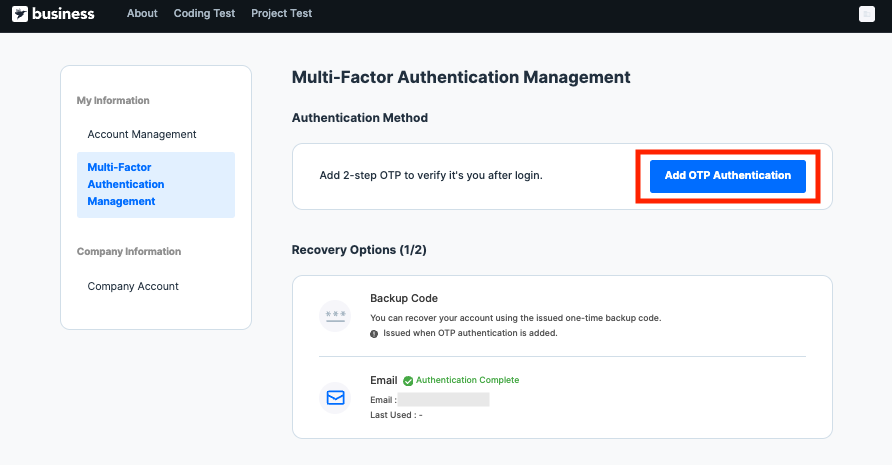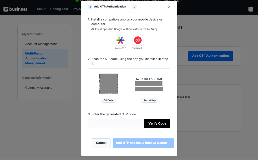 Go to Add OTP Authentication on the Programmers/Monito page.Click Add OTP Authentication.(Account Management → Multi-Factor Authentication Management → Add OTP Authentication)
