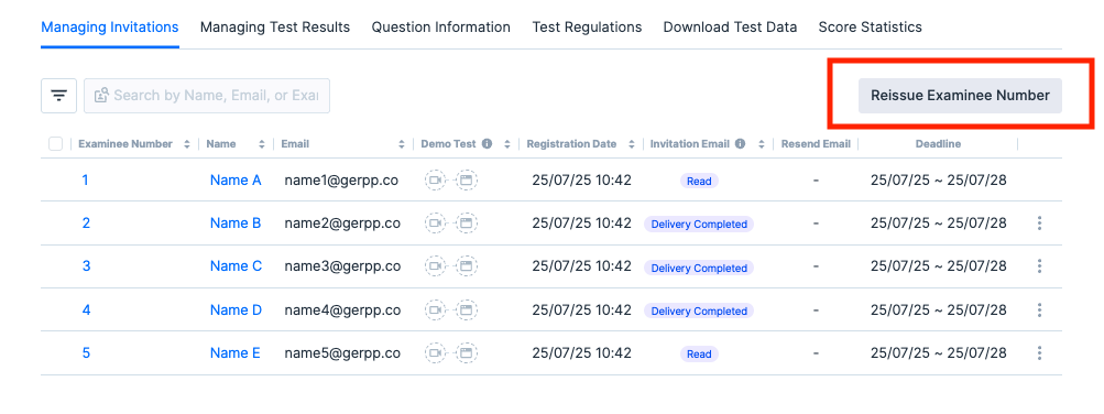 Click the Reissue Examinee Number button in the Managing Invitations tab.