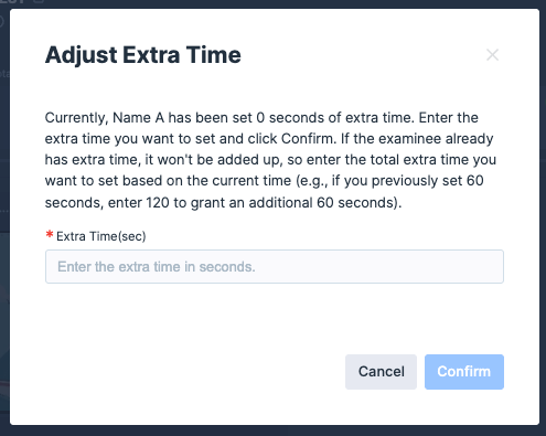 Enter the extra time in seconds, then click Confirm. For example, to give an additional 5 minutes, enter “300”.