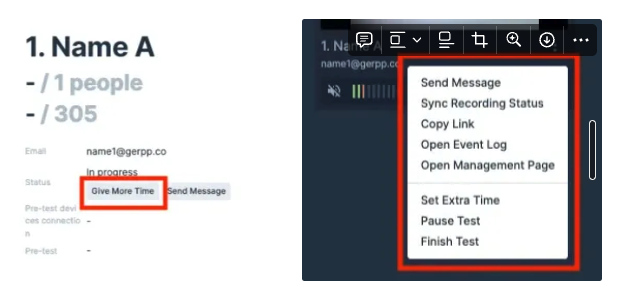 You can grant additional time to a test taker who has already started the test by using the [Give More Time] feature.