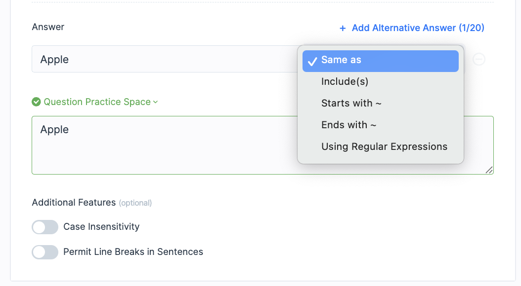 You can define answer conditions by selecting from the following options: Same as / Includes / Starts with / Ends with / Using Regular Expressions.