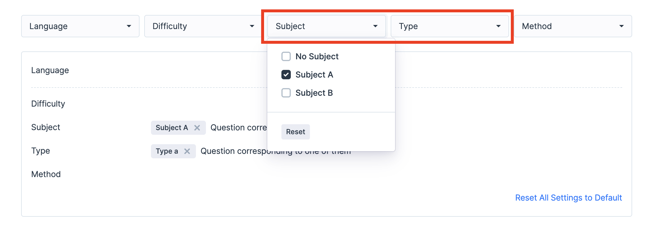 This allows you to easily filter and find specific questions by subject or type when selecting test questions or browsing the question list.