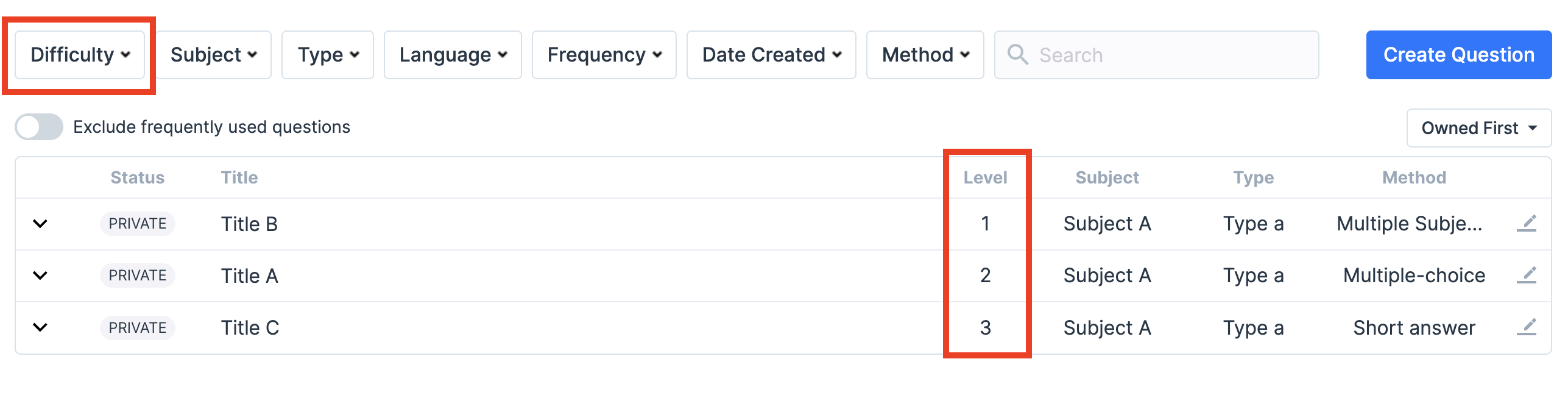This allows you to easily filter and find questions by difficulty when selecting test questions or browsing the question list.