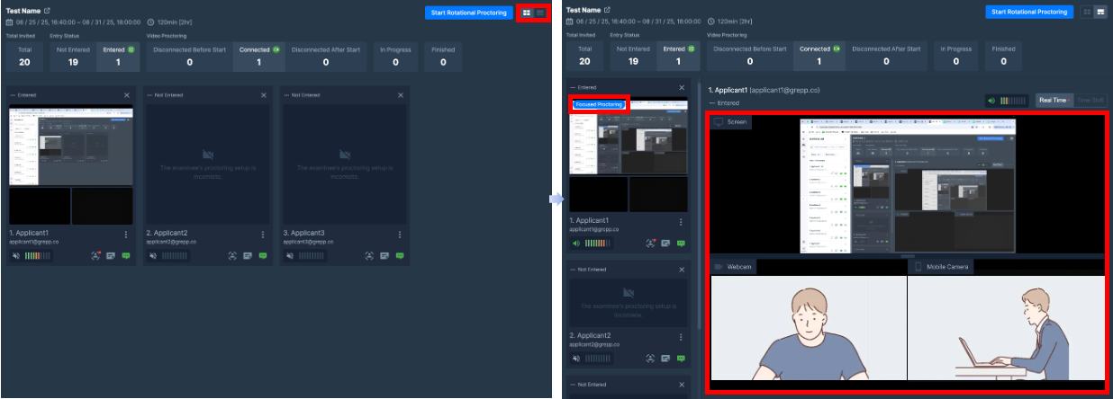 You can enlarge the screen of specific candidates for closer monitoring when needed.