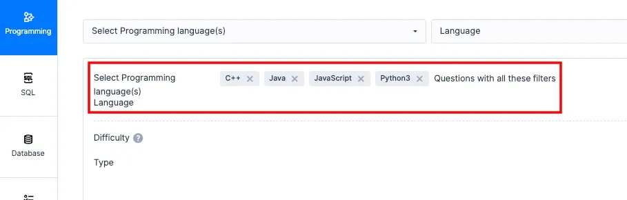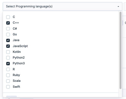 For example, if you select C++, Java, JavaScript, and Python3, only questions that support all four languages will appear in the search results.