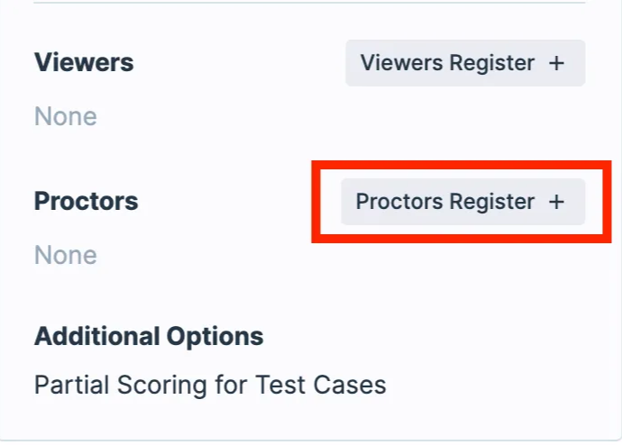 On the test management page where proctors are needed, click the Proctor Register + button located at the bottom of the right-side menu.