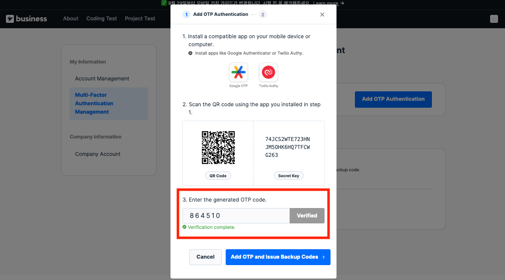 To enable multi-factor login, you must first register your authentication method.An authentication method refers to a tool or app that issues your OTP (One-Time Password) security code.By setting up two-step authentication, you can significantly enhance account security.