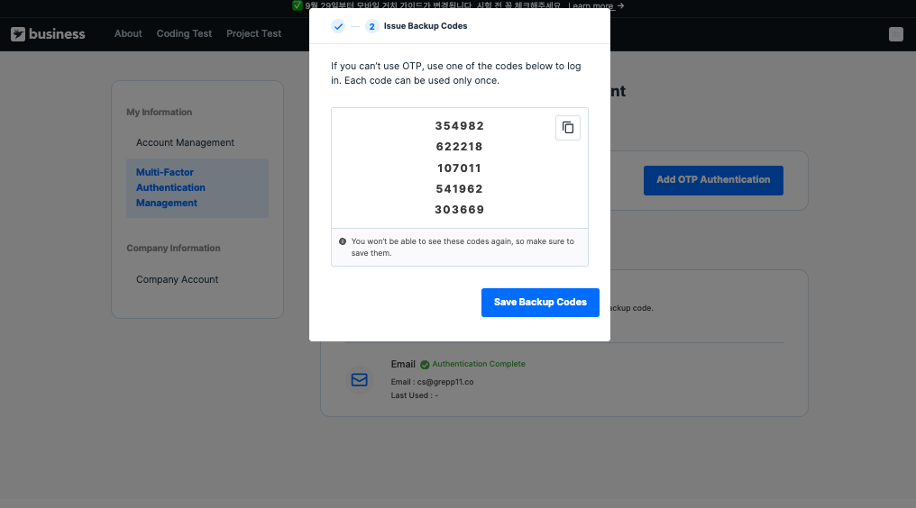 Save your backup codes securely.If you’re unable to use your OTP app, you can log in using a backup code.Each backup code can only be used once.