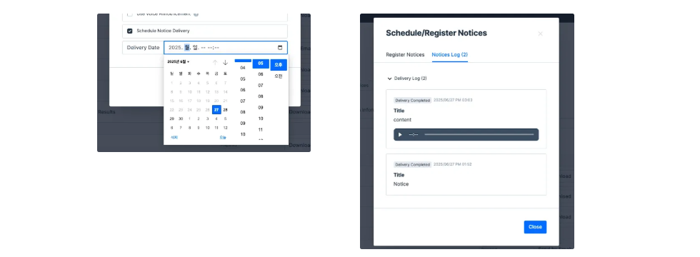 After recording, enter a title and message content, then click Register.The voice message will be delivered immediately and displayed at the bottom of the test takers’ screens.