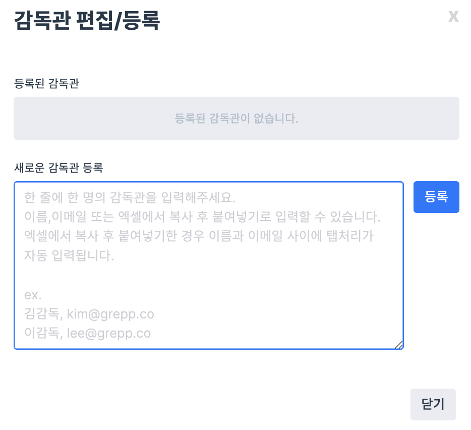 ex) 감독관1, test1@grepp.co 감독관2, test2@grepp.co