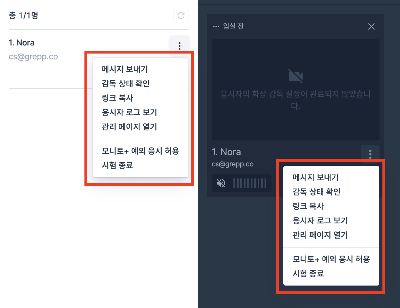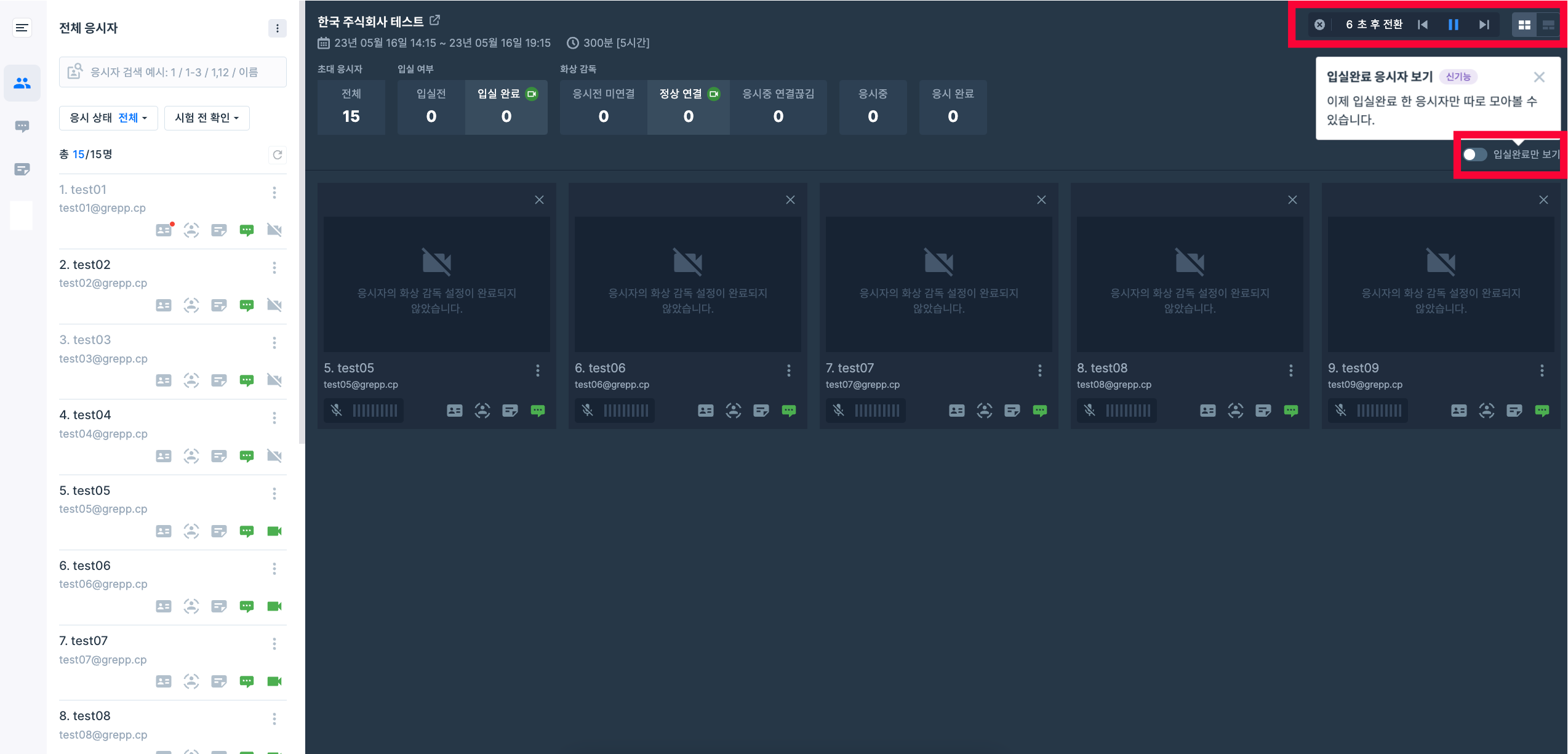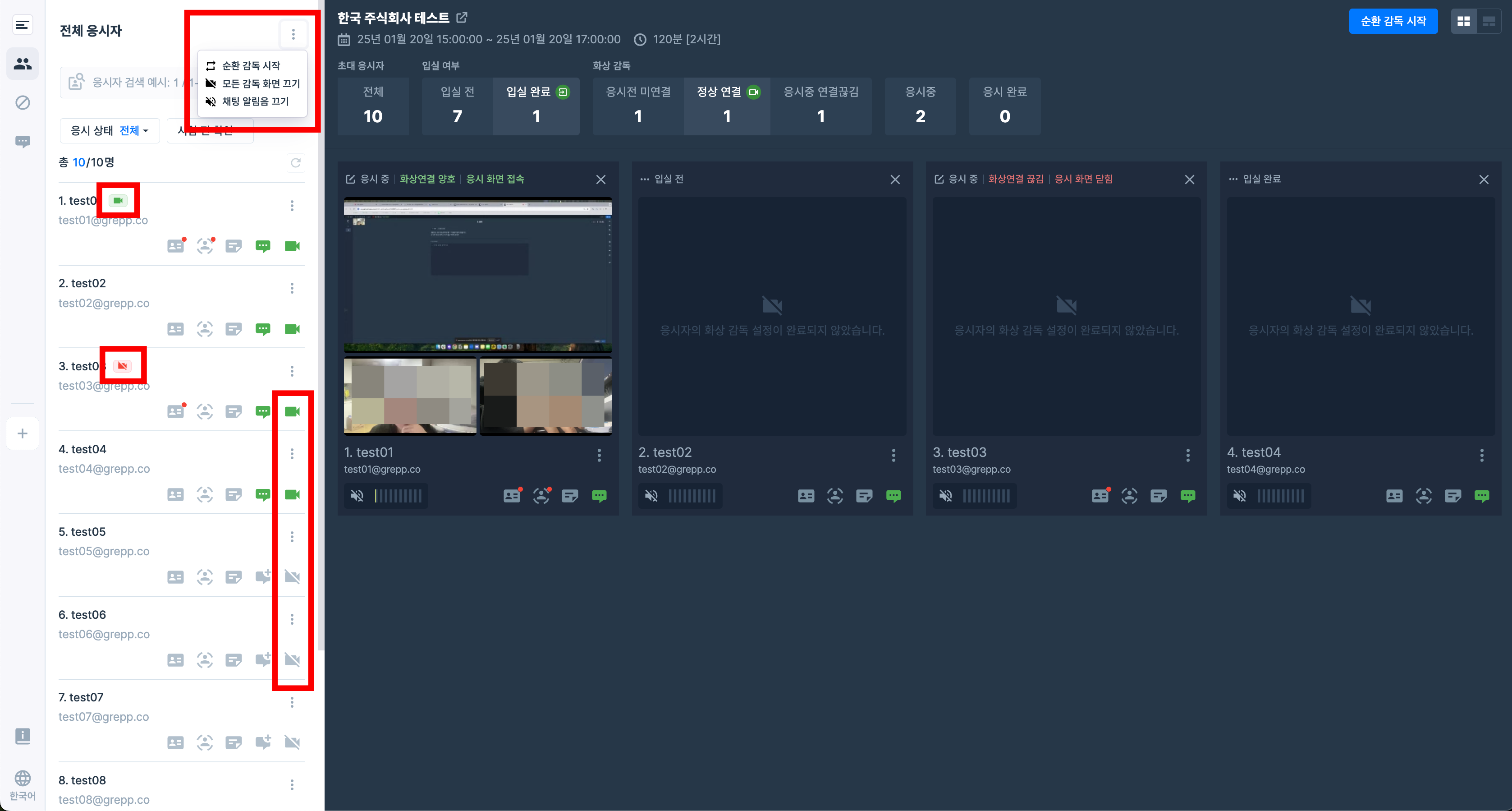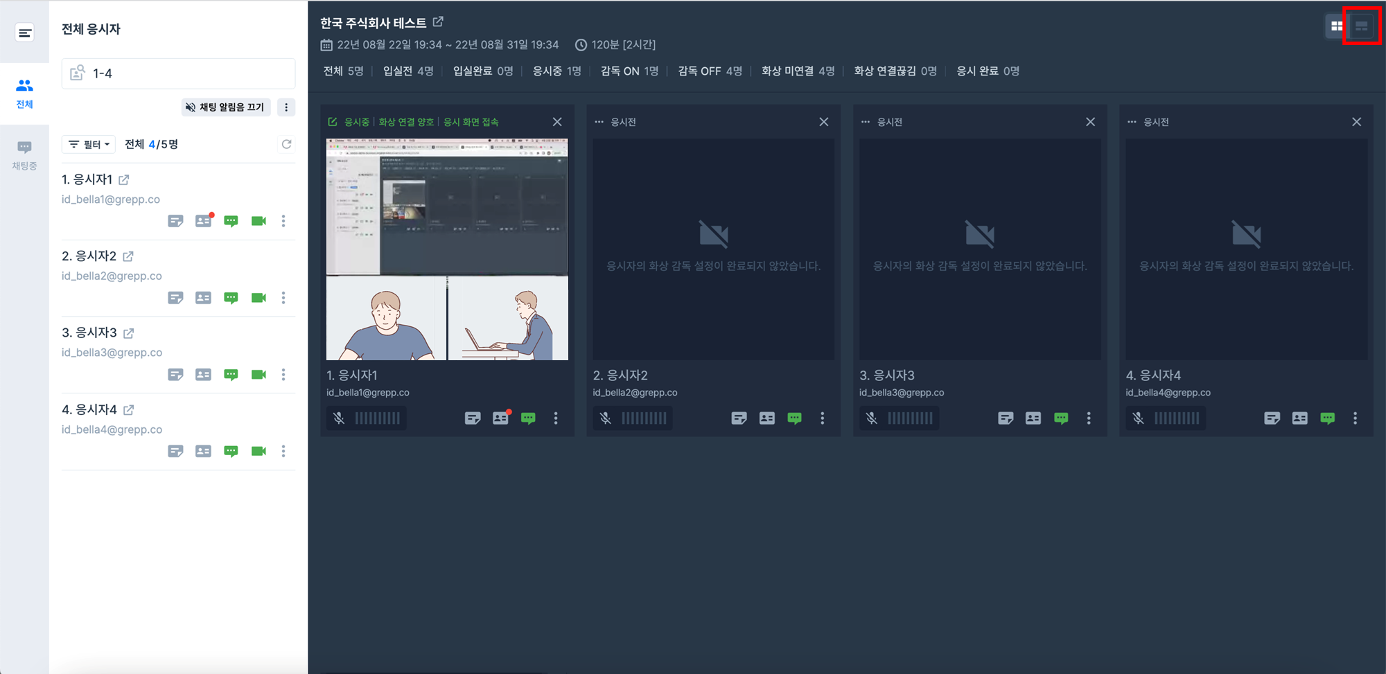 카메라 모양의 아이콘을 눌러 각 응시자의 감독 화면을 켜고 끌 수 있습니다.
