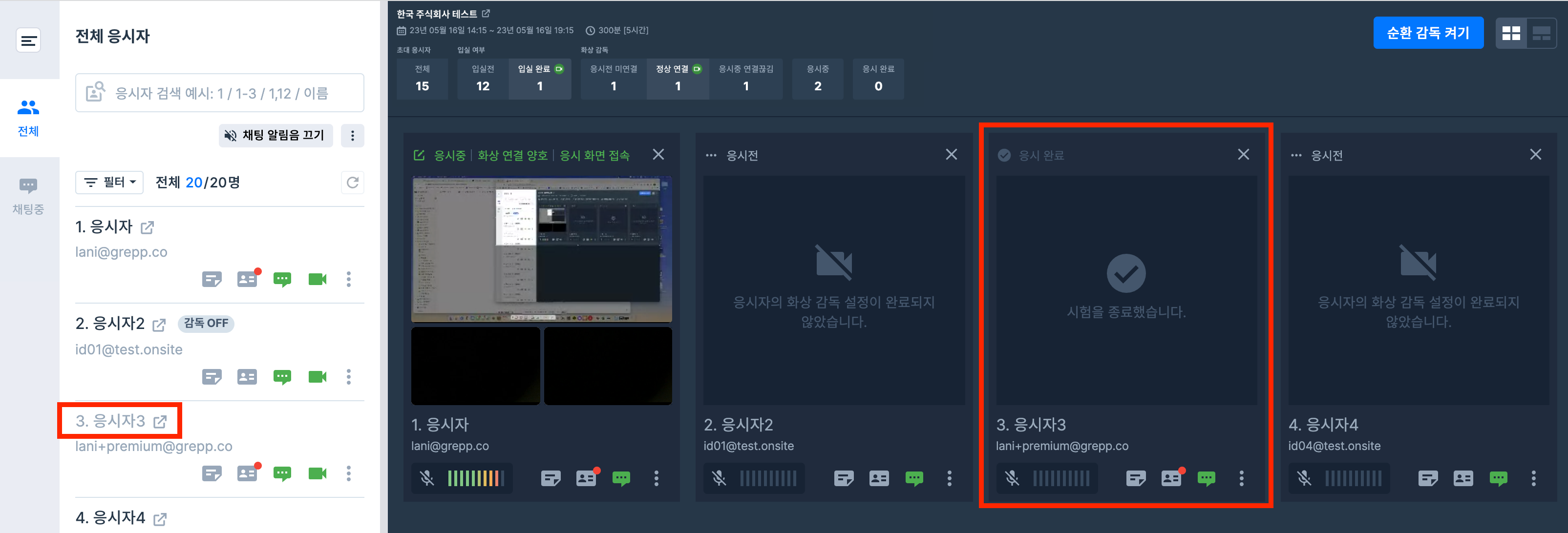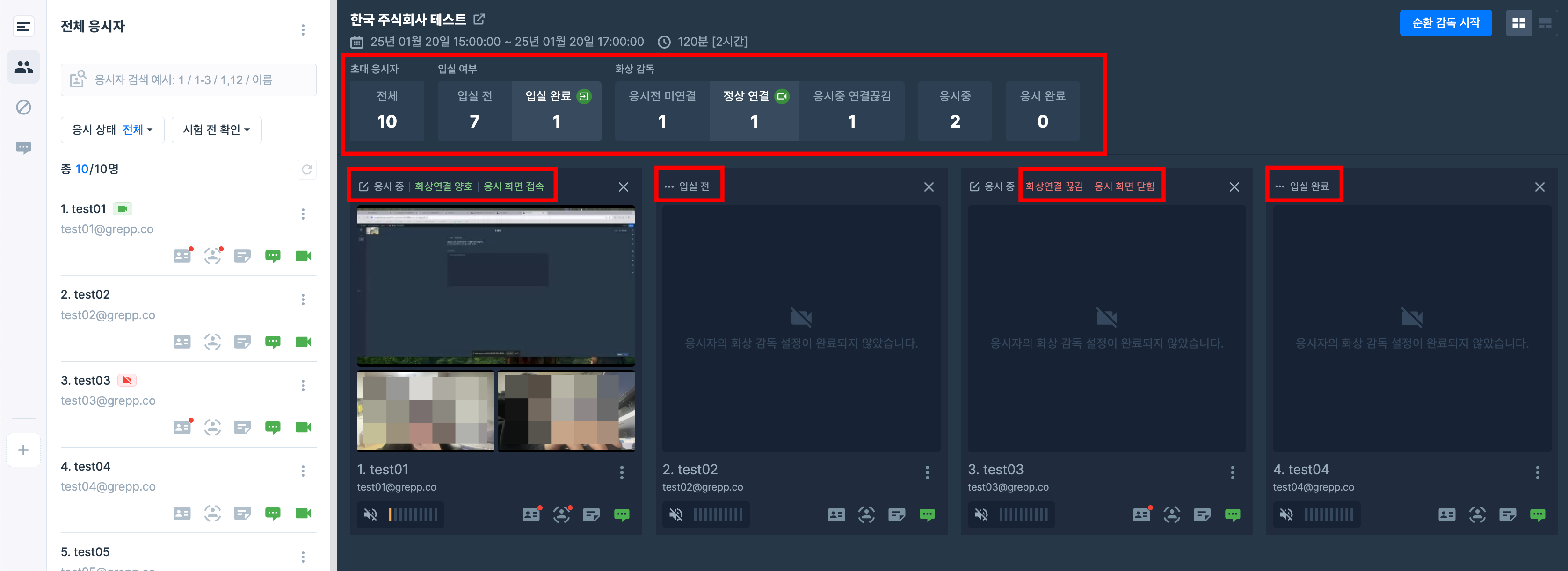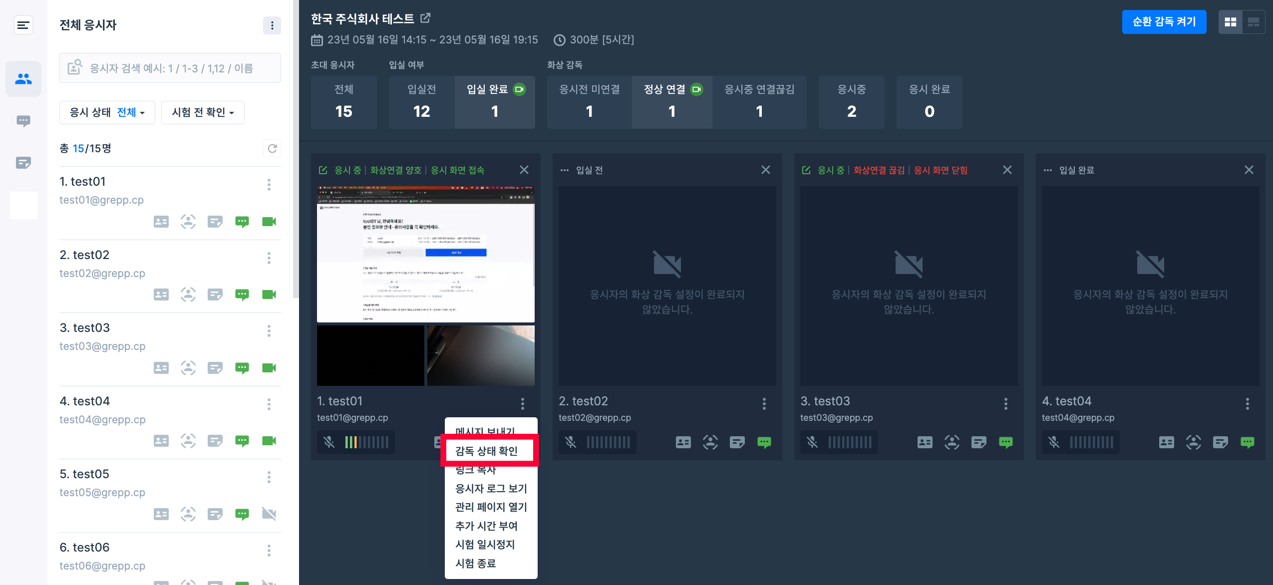 감독실 화면 왼쪽의 응시자 목록에서 각 응시자의 연결 상태를 확인할 수 있습니다.