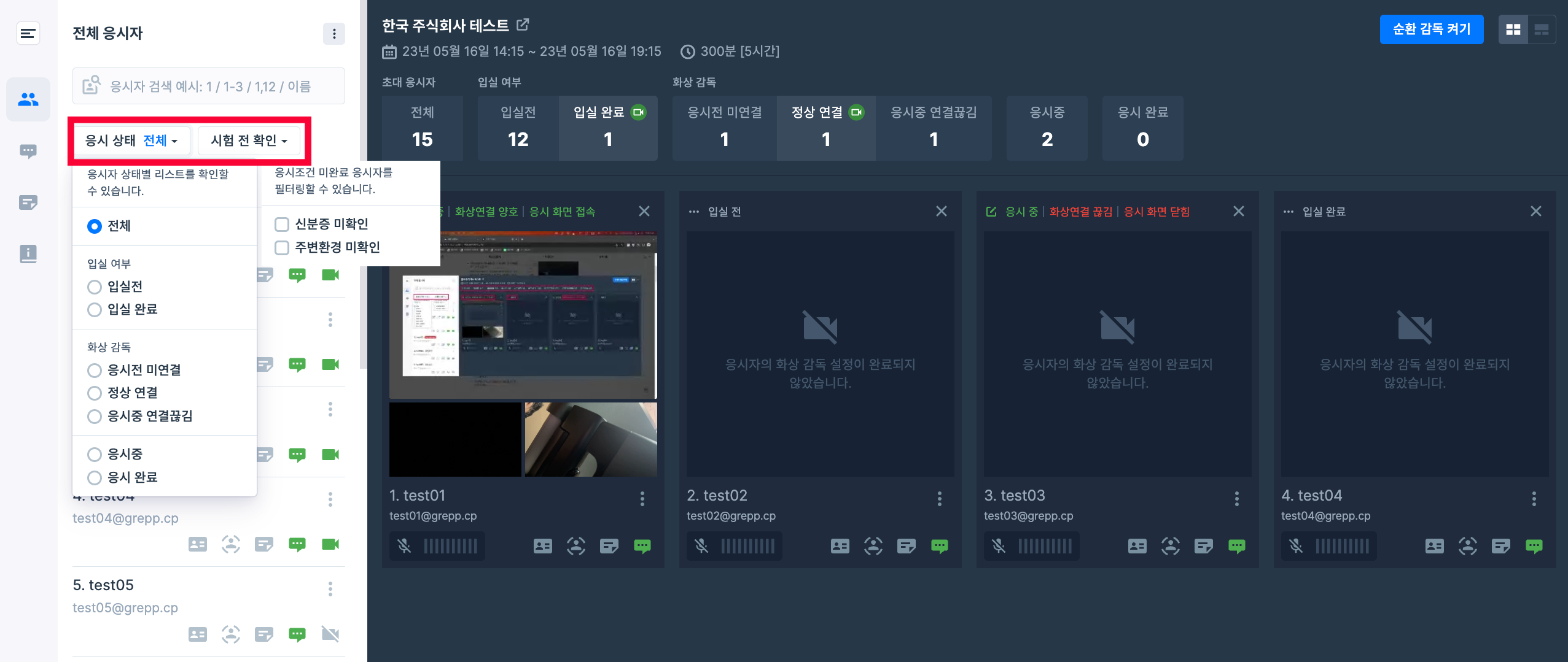 감독실 화면 왼쪽의 응시자 목록 상단에 있는 필터 버튼을 눌러 각 상태에 해당하는 응시자만 확인할 수 있습니다.