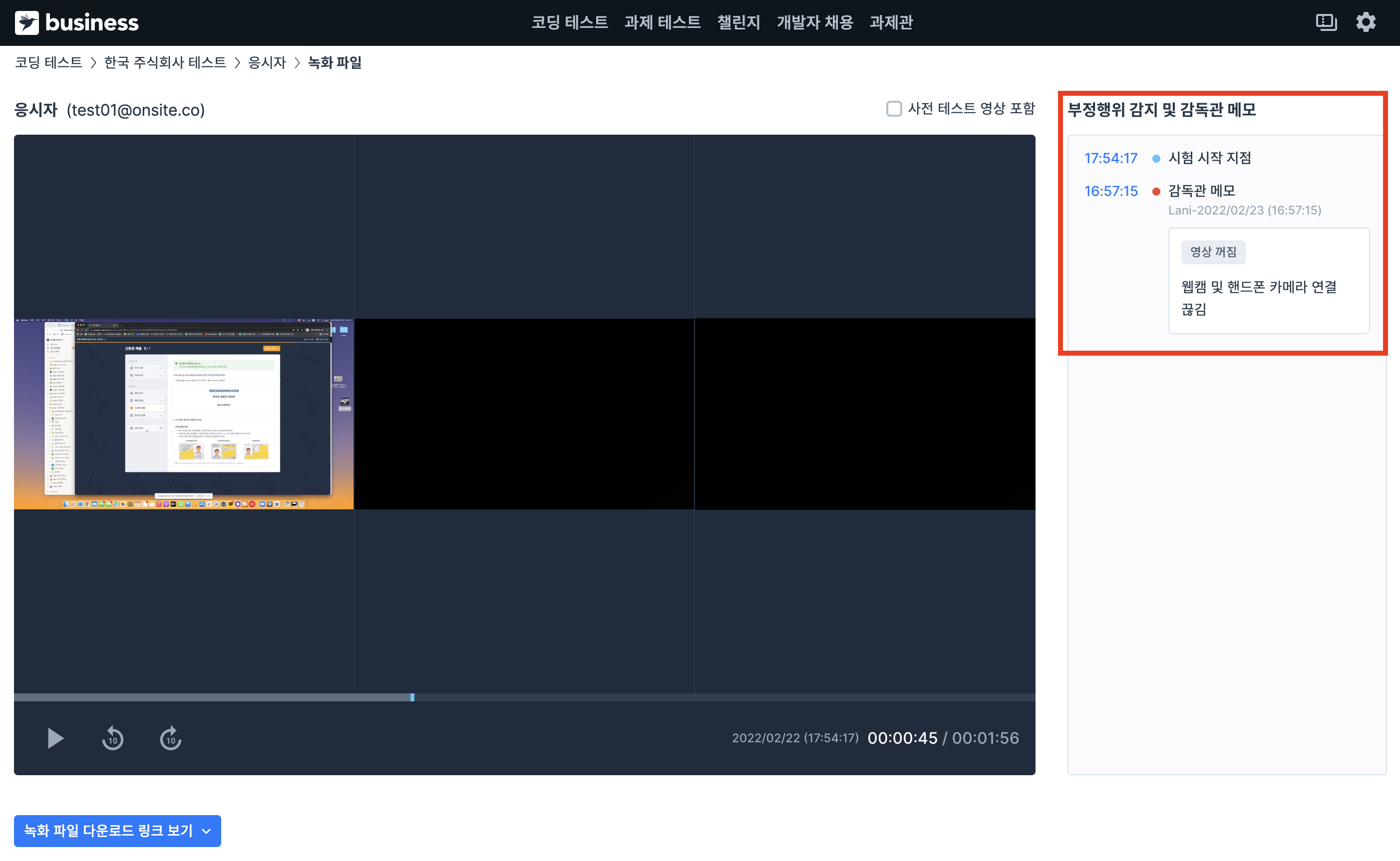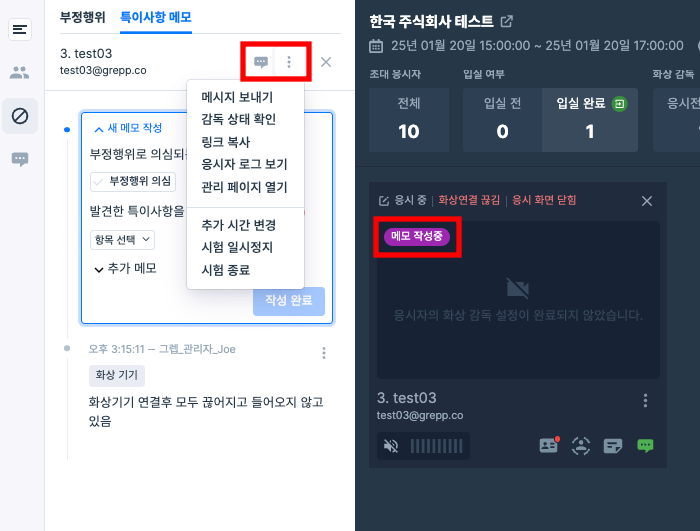 시험 종료 후에도 해당 응시자의 녹화 영상과 함께 메모 기록을 확인할 수 있습니다.