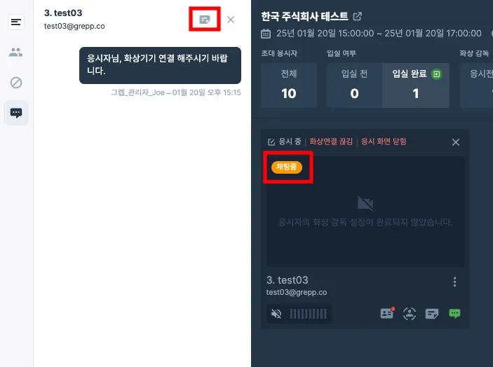응시자와 실시간으로 채팅을 주고 받을 수 있습니다.