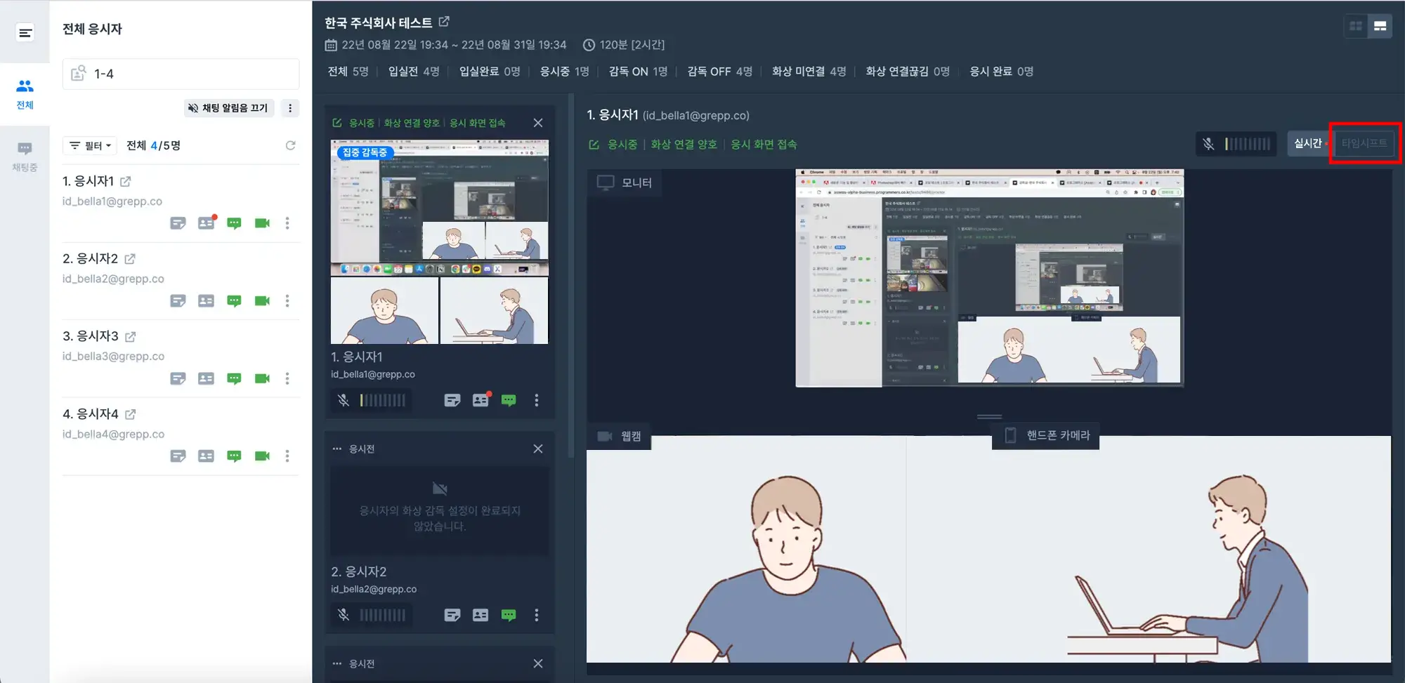 *참고 : 시험을 시작하지 않았거나 시험이 종료된지 30분이 지난 응시자에 대해서는 타임 시프트 기능을 사용할 수 없습니다.