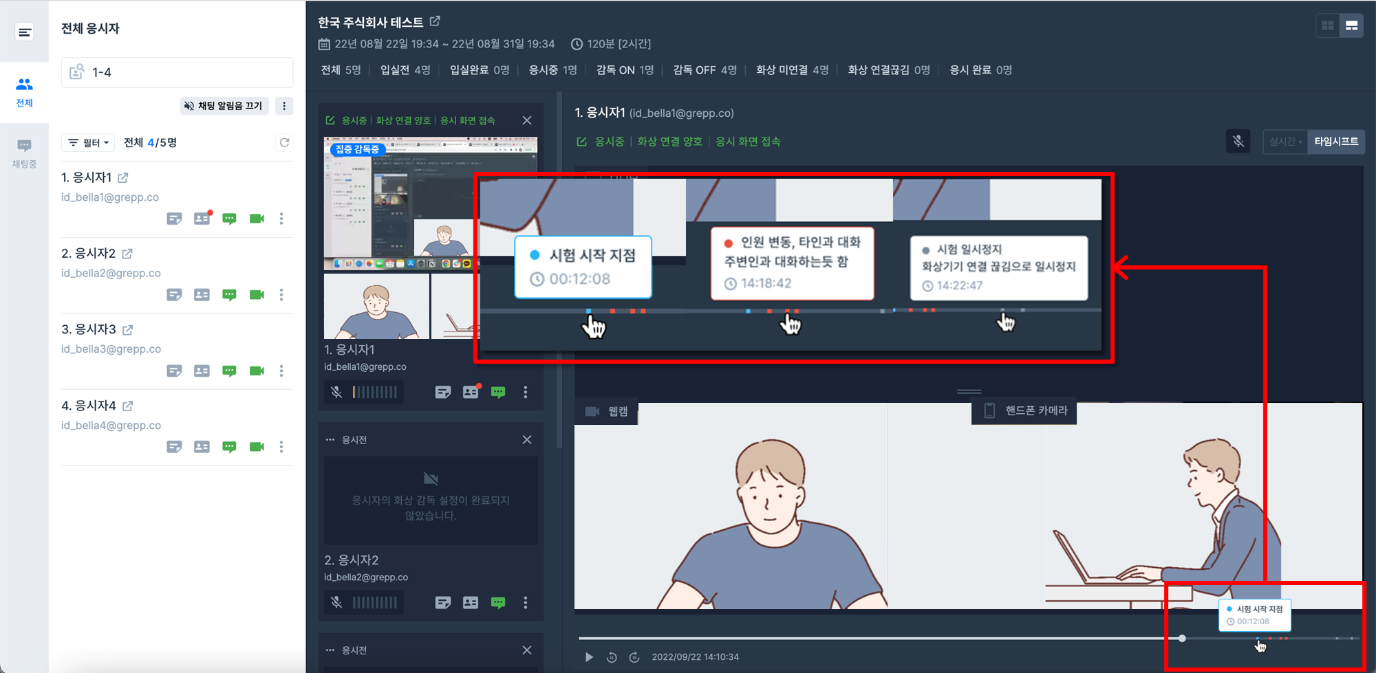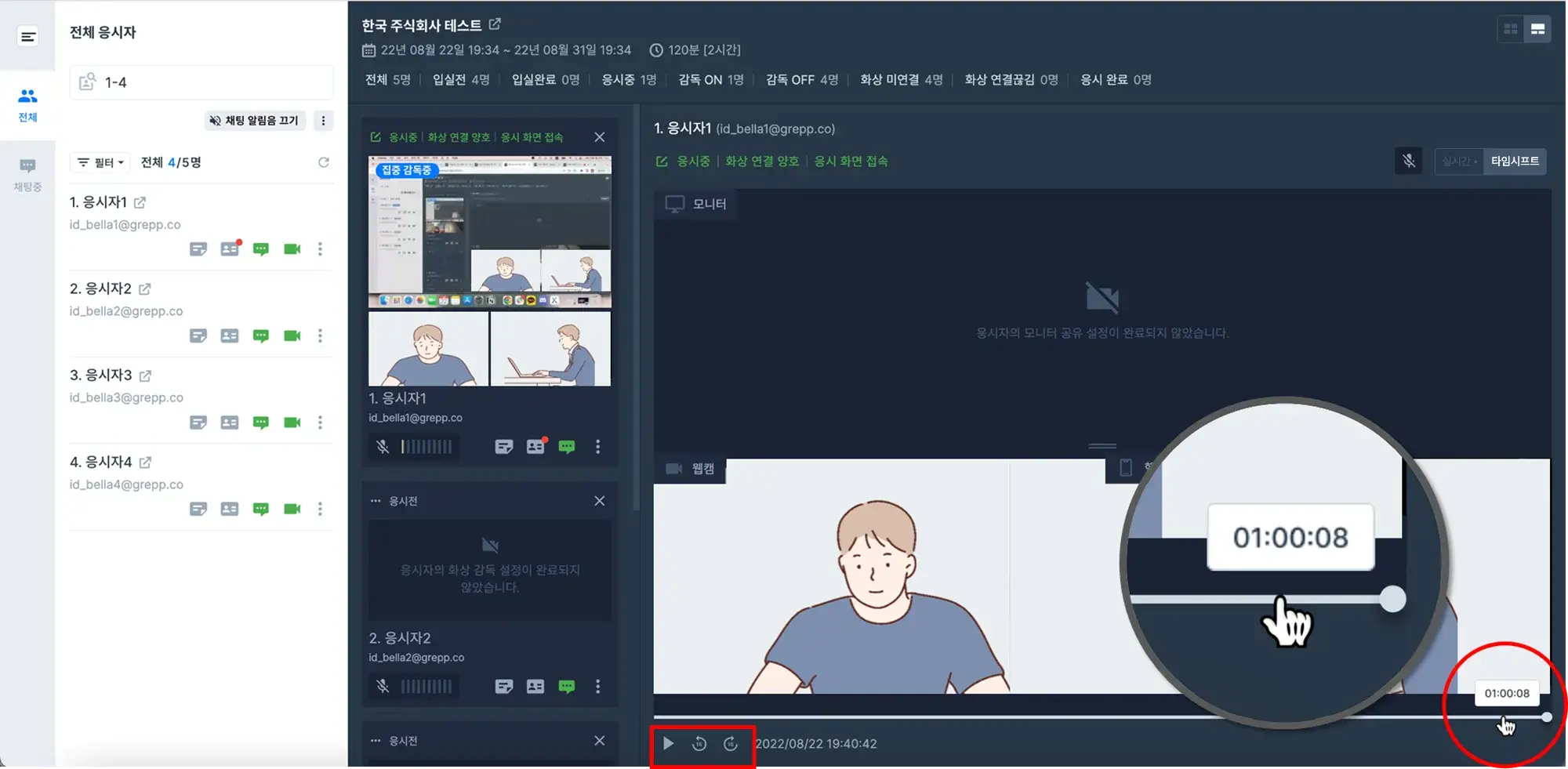 응시자 영상 타임 시프트 기능은 앞부분의 지나간 감독화면을 원하는 만큼 시간을 돌려보며 놓친 감독내용도 바로 확인할 수 있게 합니다.