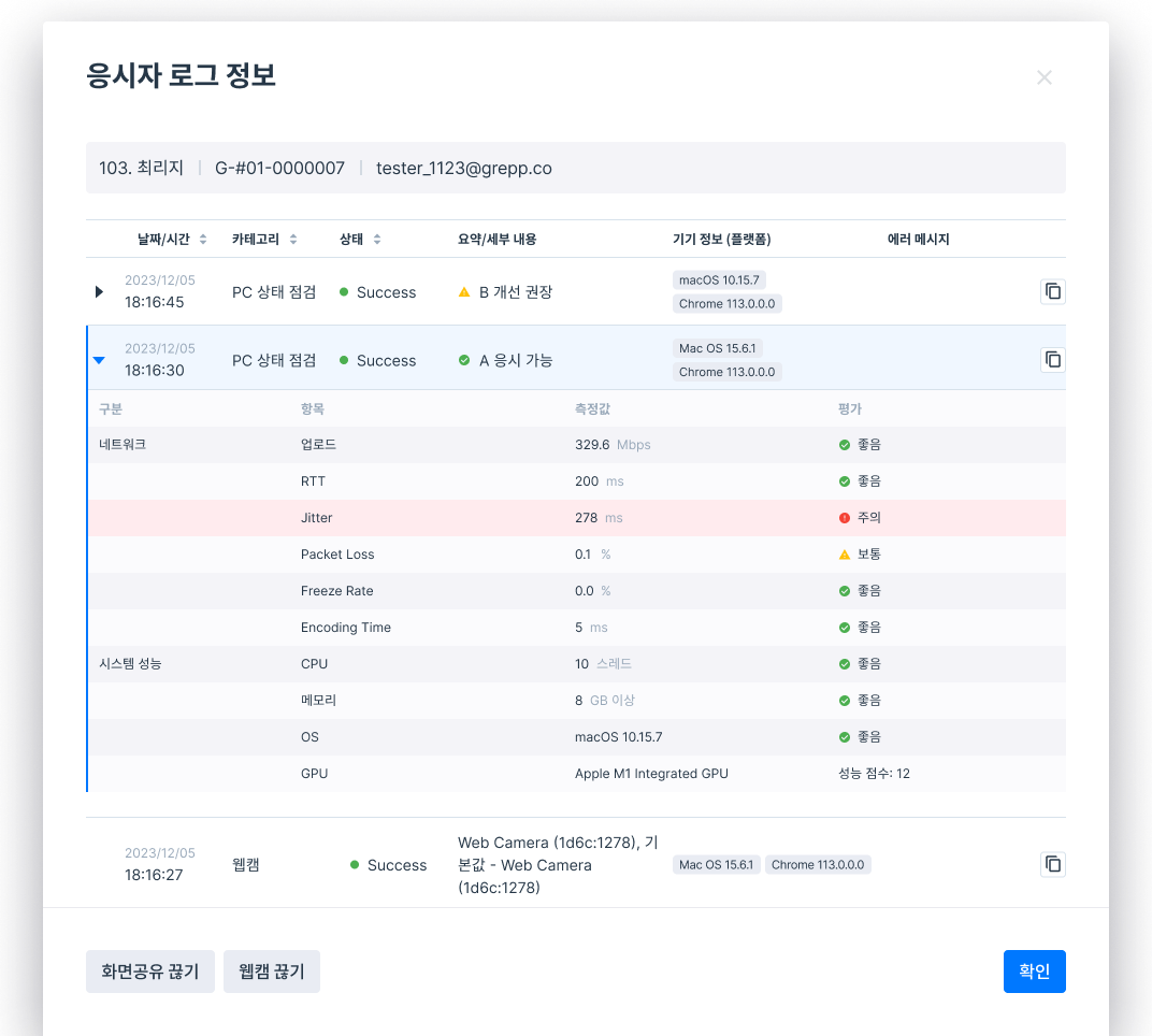 응시자 로그 보기 응시자의 시험환경 로그를 확인할 수 있습니다. 입실 및 사전테스트 입장, 화면공유, 화상기기연결 시도 및 성공/실패 여부 등이 일시와 함께 표시됩니다.