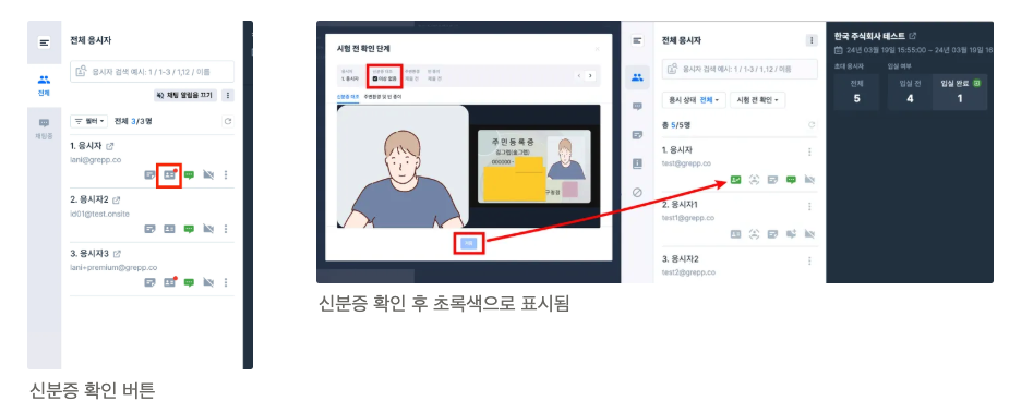 각 응시자의 이름 옆 명함 모양의 아이콘를 클릭하여 제출한 신분증을 확인합니다.
