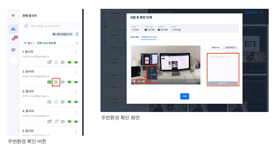 아이콘 버튼에 빨간색 점 표시는 주변환경 제출 완료(최초 영상 및 요청에 의한 재촬영 포함)된 응시자입니다.