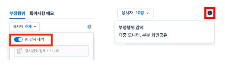 응시자가 부분 화면만 공유하거나 다중 모니터를 이용하고 있는 경우 자동으로 감지하여 부정행위 탭에서 알림을 제공합니다.