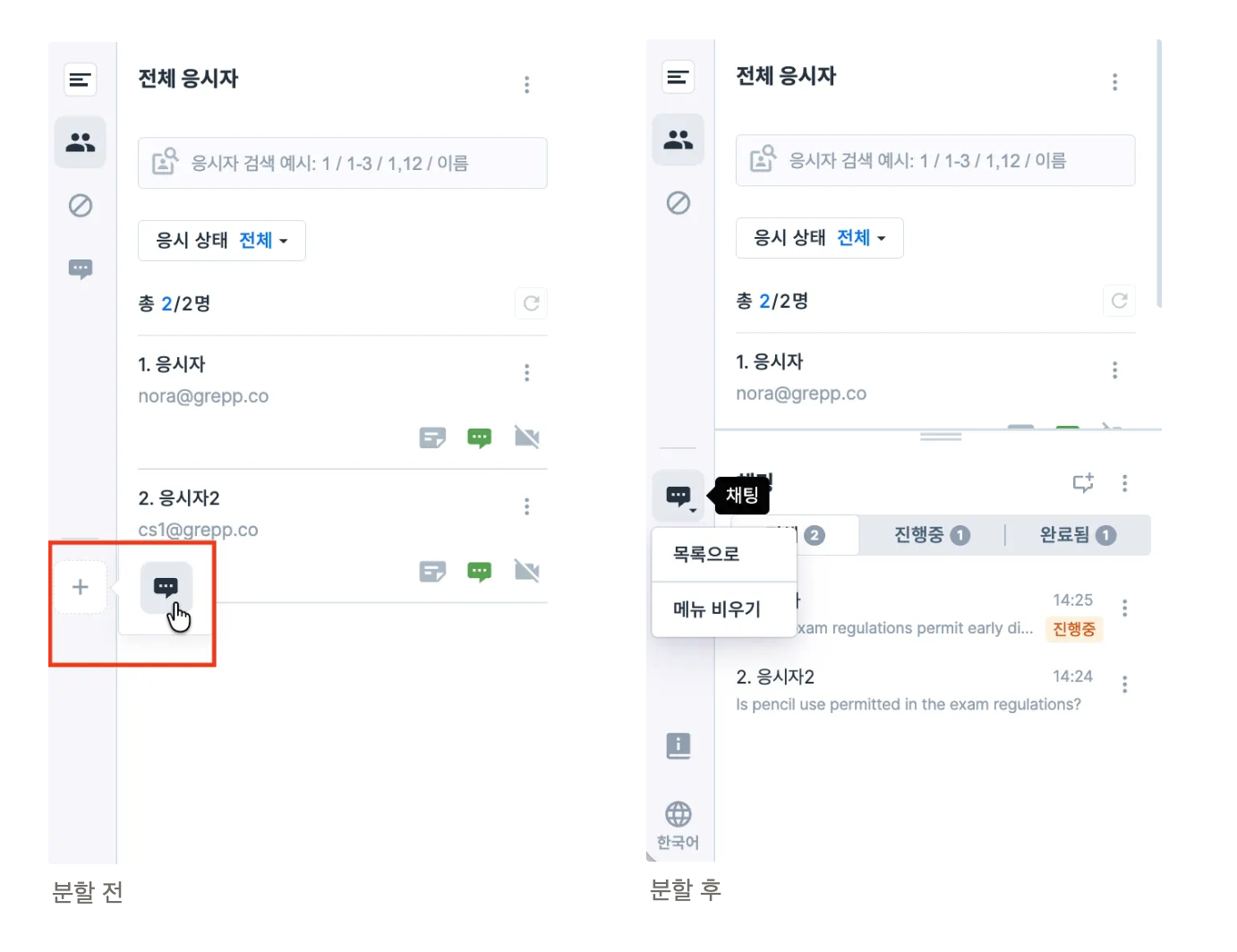 채팅이 필요한 경우, 상단의 채팅 아이콘을 클릭하여 해당 응시자의 채팅으로 이동할 수 있습니다.