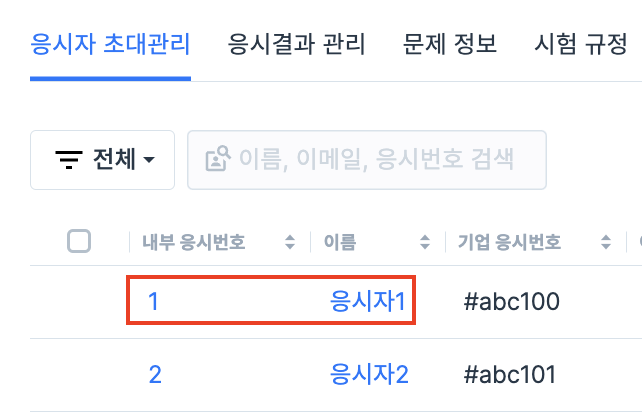 테스트 페이지 하단의 응시자 정보를 클릭해 응시자 페이지에 접속합니다.