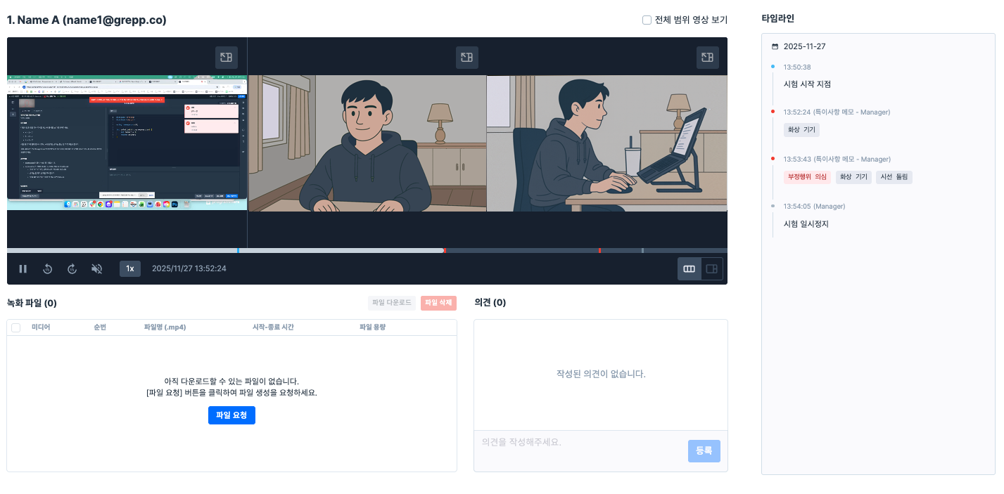 시험 중 녹화 된 화면과 기록된 내용을 확인할 수 있습니다.