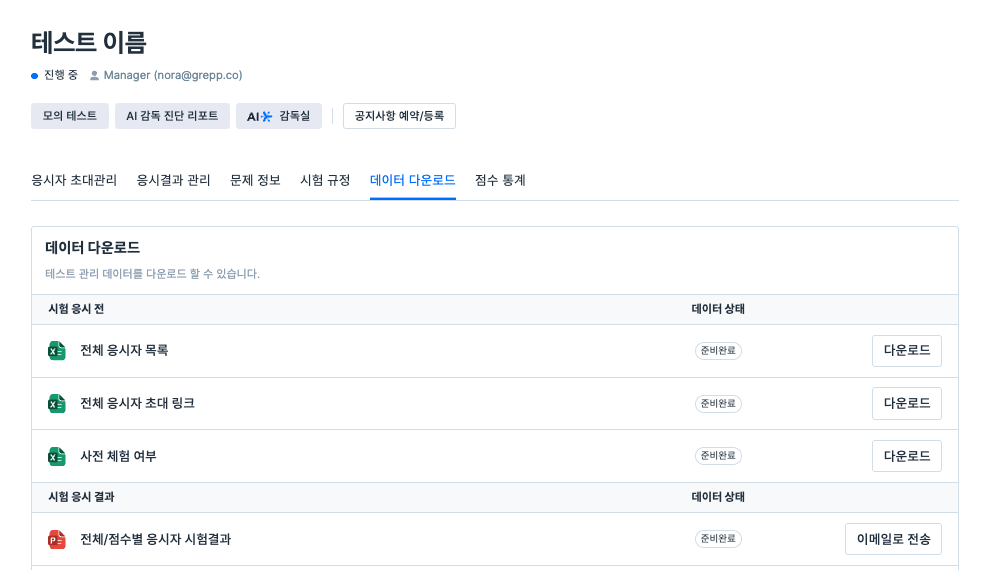 시험 관리 페이지의 데이터 다운로드 탭에서 화상감독 로그를 엑셀 형식으로 다운로드할 수 있습니다.