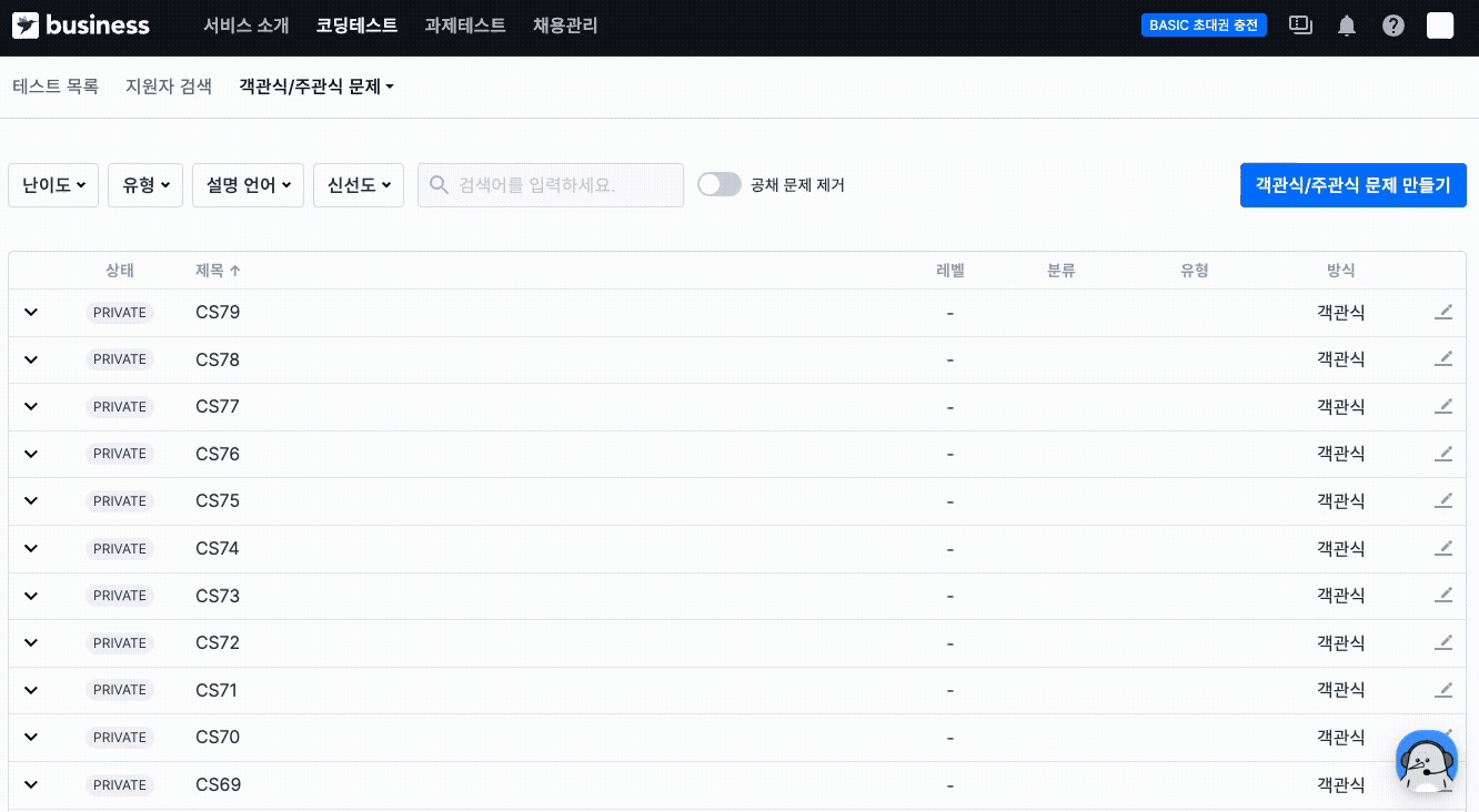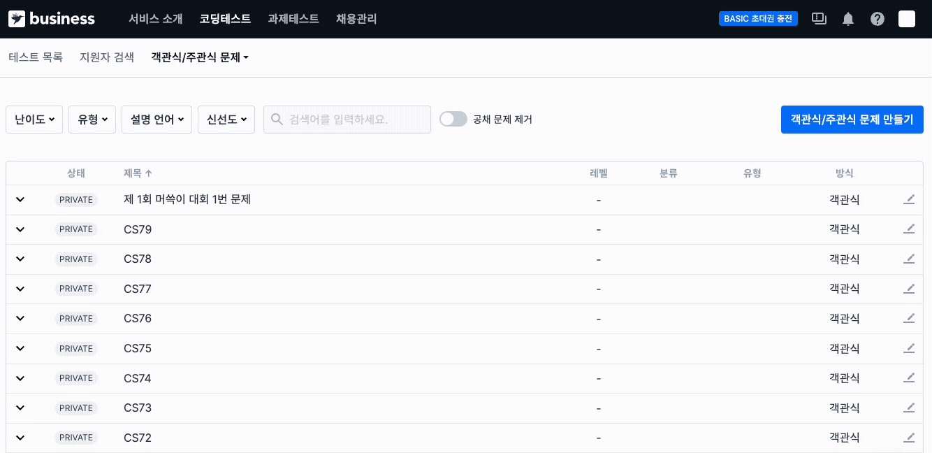 문제 유형 페이지에서 오른쪽 상단의 문제 만들기를 클릭합니다.