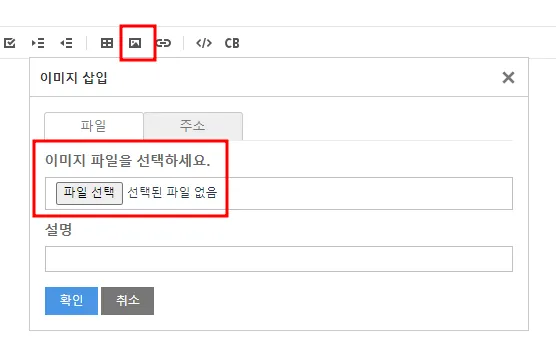 사진 모양 아이콘의 이미지 삽입 버튼을 클릭 후 파일 선택을 클릭 합니다.