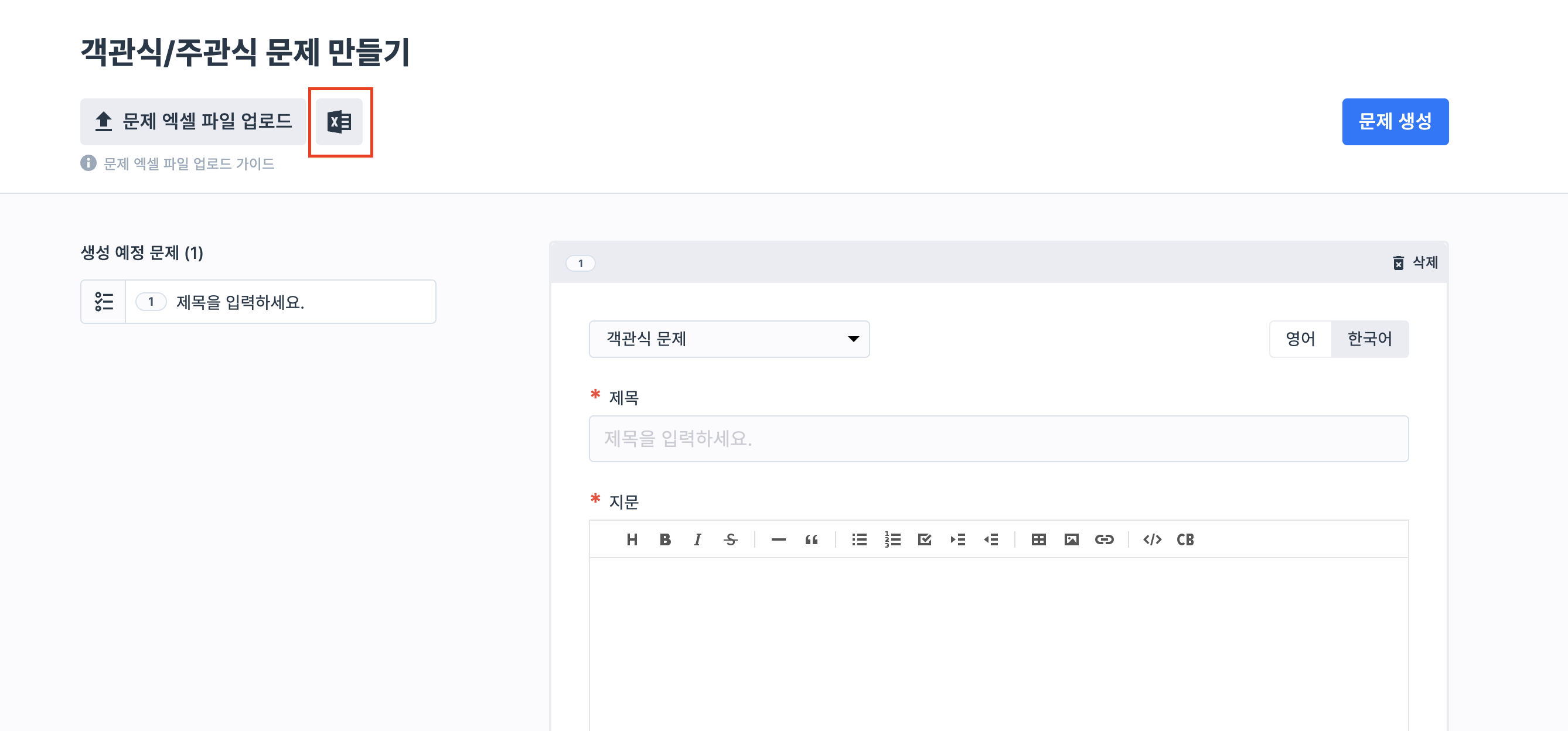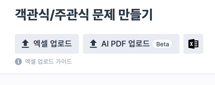 문제 엑셀 파일 업로드 가이드에서 자세한 설명을 확인할 수 있고, 엑셀 양식이 포함된 샘플 파일을 받을 수 있습니다.