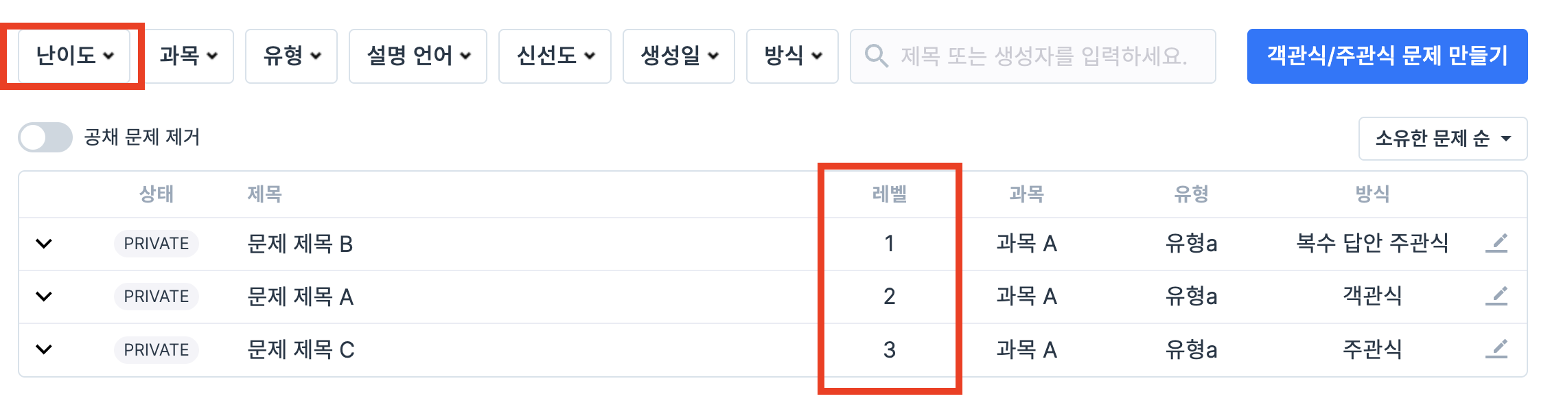 테스트 문제 선택, 문제 목록 화면에서 특정 난이도 문제를 손쉽게 찾을 수 있습니다.