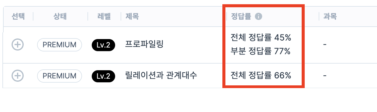 테스트 문제 선택, 문제 목록 화면에서도 문제 정답률을 확인할 수 있습니다.