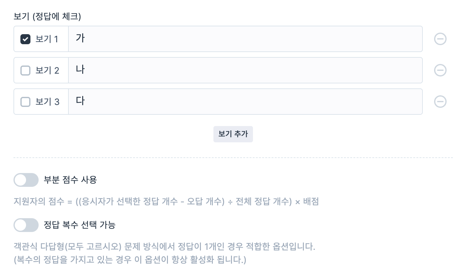 정답이 두 개 이상인 경우, 부분 점수 반영 옵션으로 부분 점수 적용 여부를 지정할 수 있습니다.