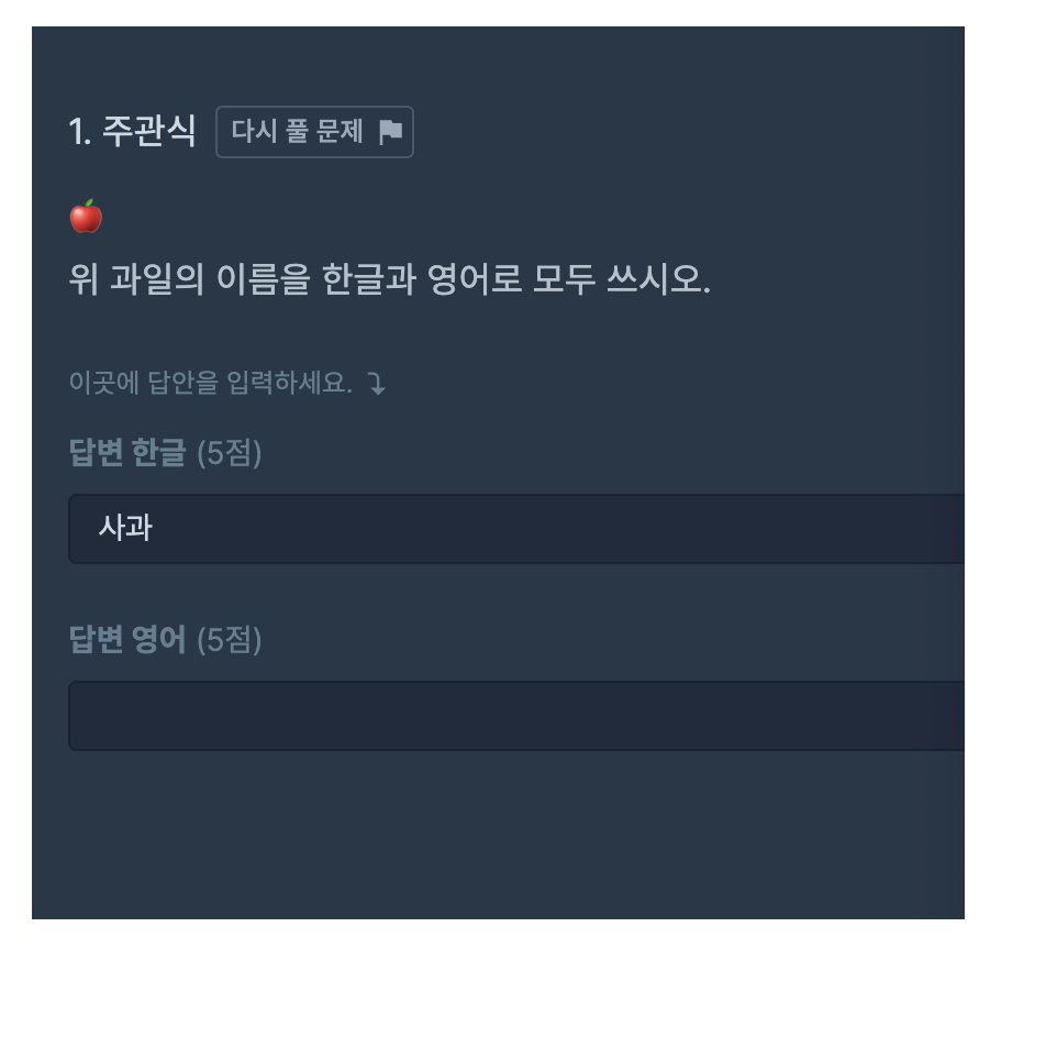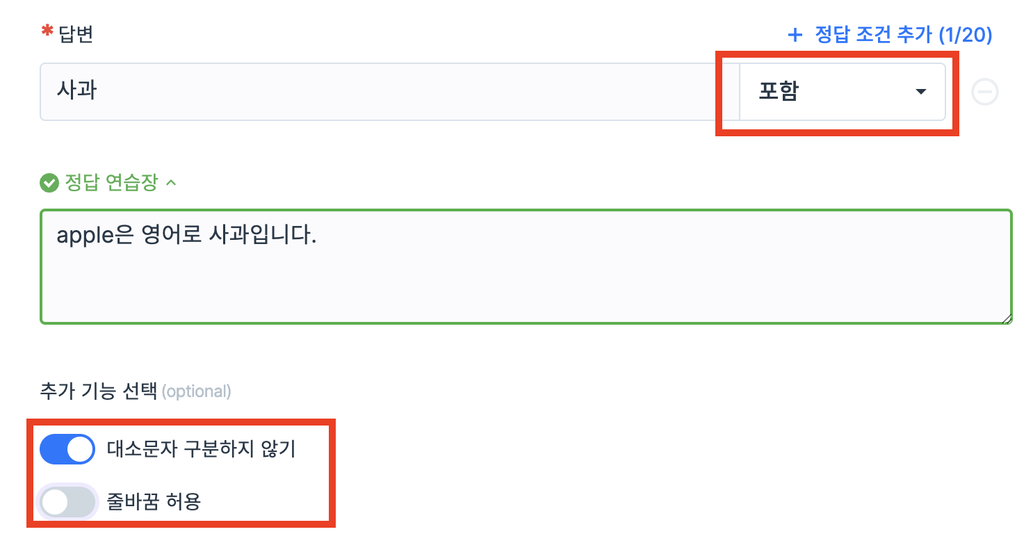 정답 조건(같음/포함-/로 시작/-로 끝/ 정규표현식 사용)을 선택해 입력할 수 있습니다.