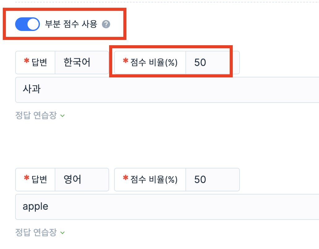 옵션을 활성화 하면 각 정답마다 점수 비율을 설정할 수 있습니다.