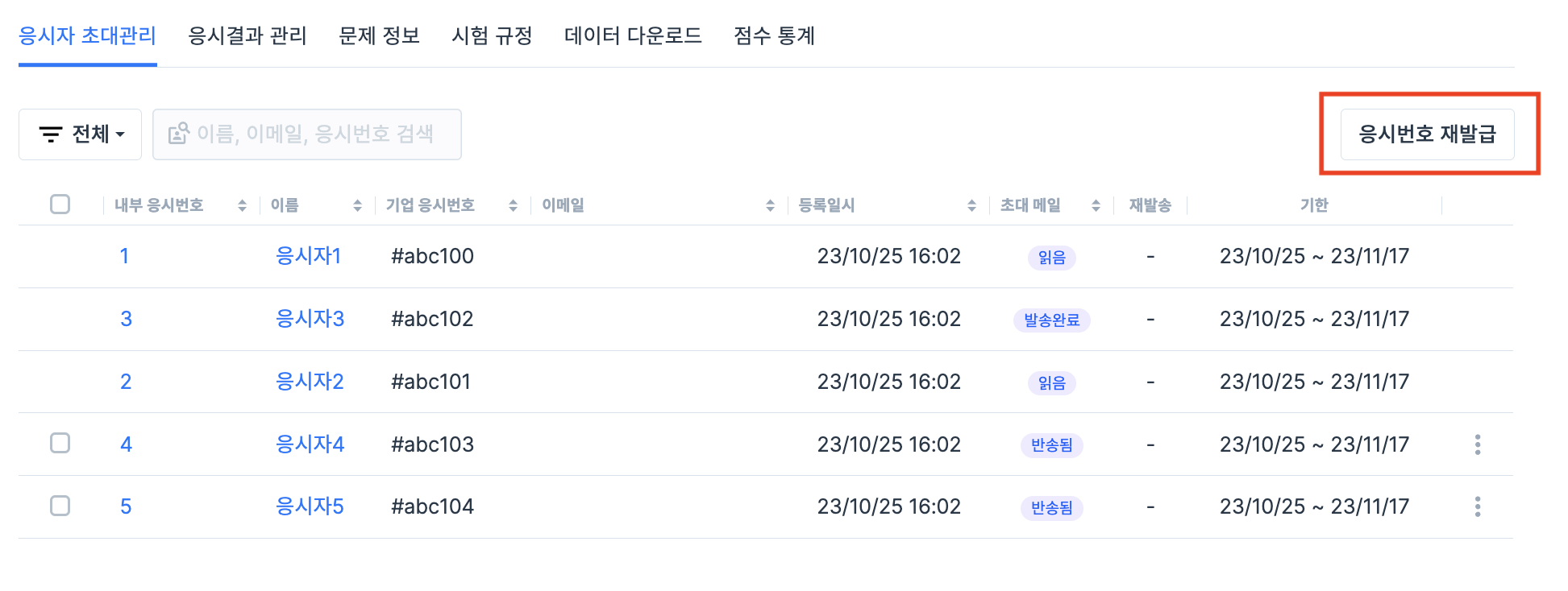 응시자 초대 관리 탭에서 응시번호 재발급 버튼을 클릭합니다.