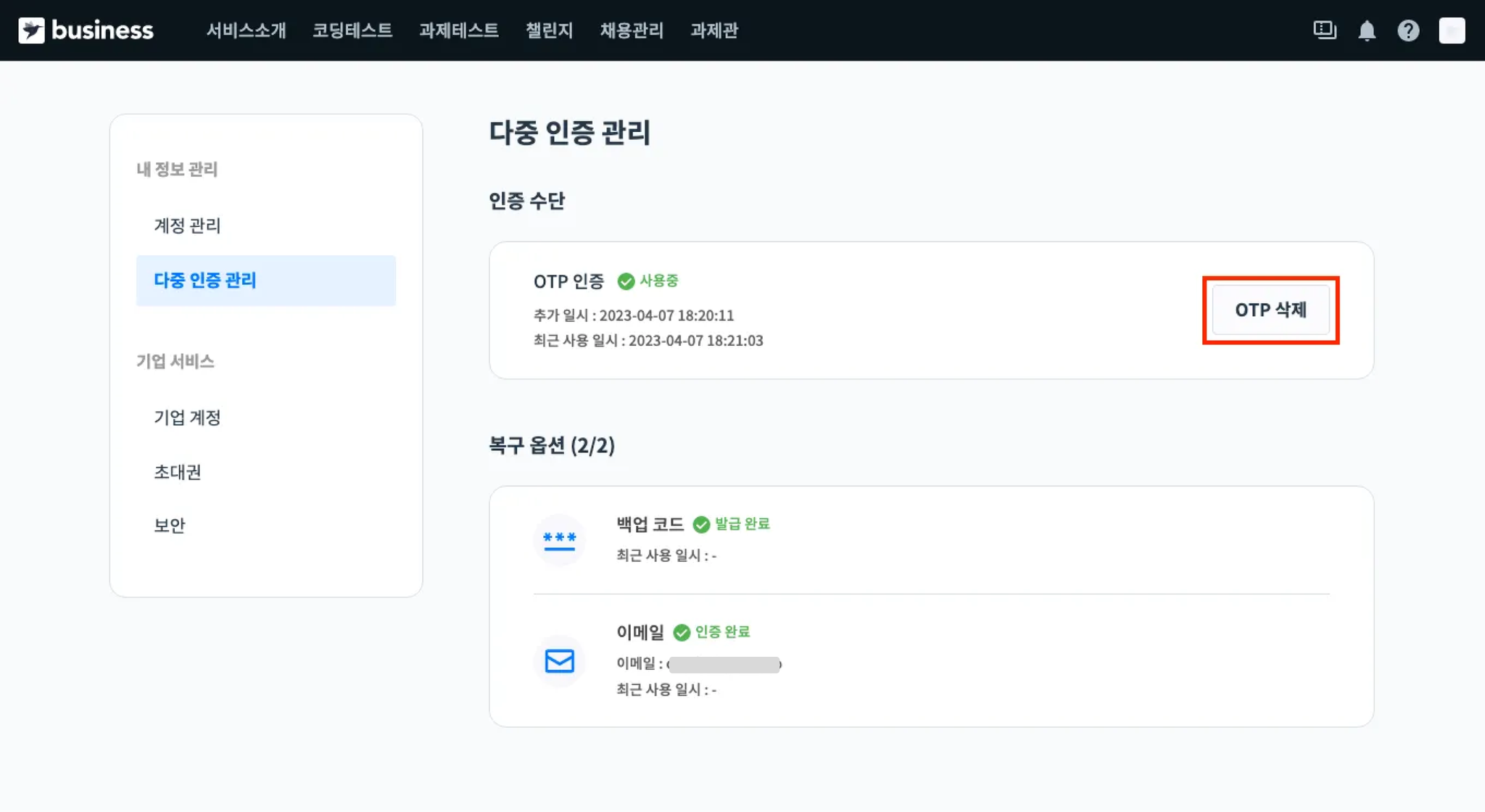 ‘계정 관리 → 다중 인증 관리’ 페이지에서 OTP를 삭제하고, 재등록해주시면 됩니다.OTP를 삭제하면 기존에 발급된 백업 코드도 함께 삭제됩니다.OTP 삭제 후 재등록 시 새롭게 발급된 백업 코드를 사용해주세요.