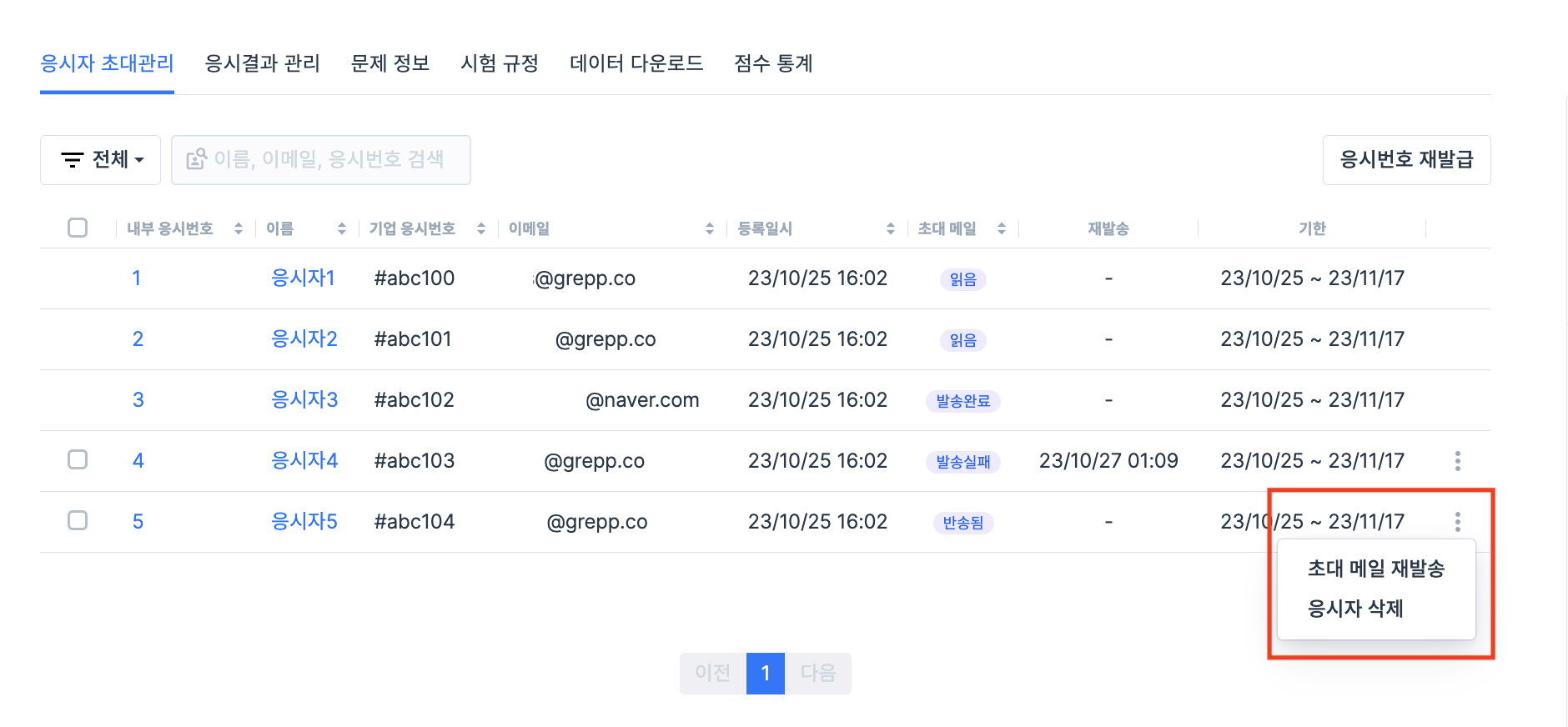 삭제할 응시자를 찾아, 우측의 점 세 개 버튼을 클릭해 응시자를 삭제합니다