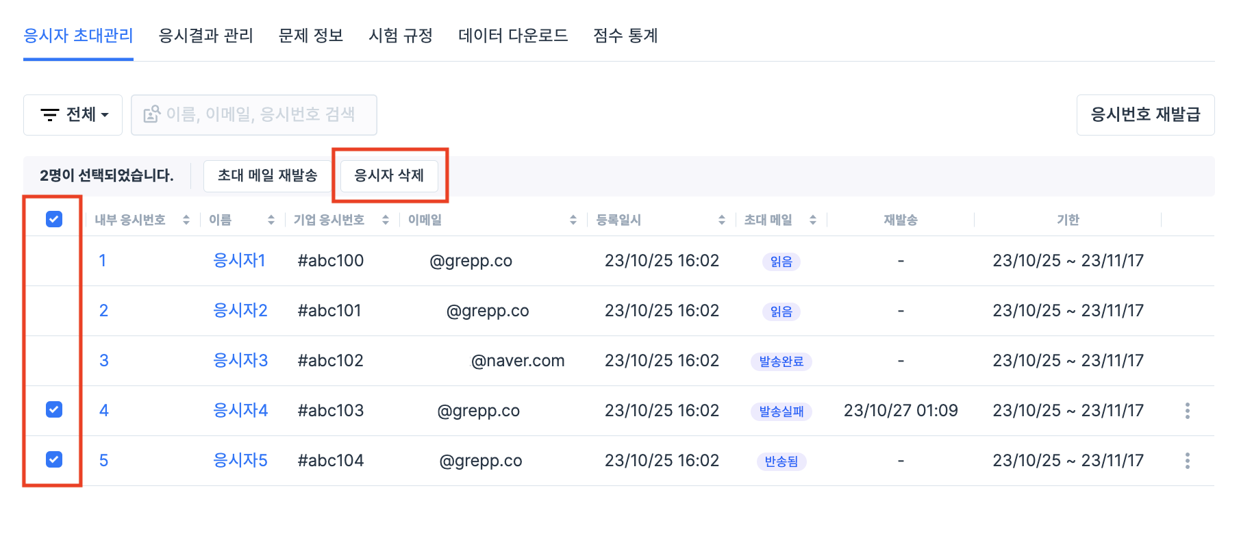 삭제할 응시자를 선택한 후 응시자 삭제 버튼을 클릭해주세요.