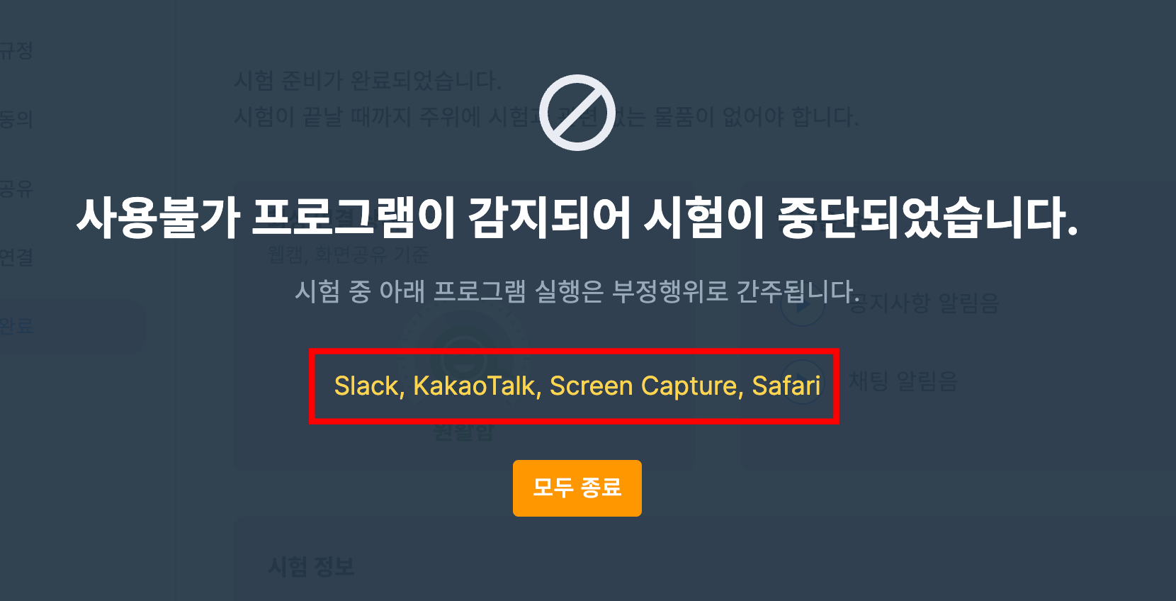 해당 기능으로 응시자가 시험 중에 응시 화면을 벗어나거나, 시험과 관계 없는 프로그램을 실행하는 것을 자동으로 감지하여 조치할 수 있습니다.