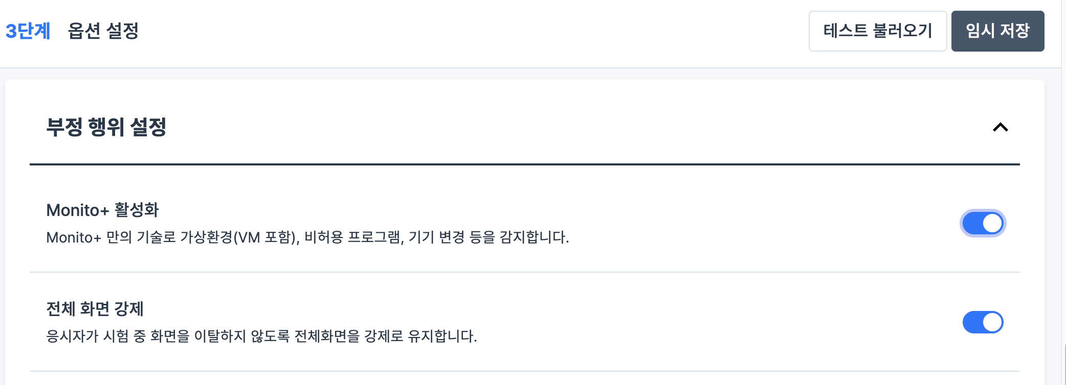 부정행위 방지 옵션에 모니토 +와 전체화면을 유지하게 하는 기능이 추가되었어요.