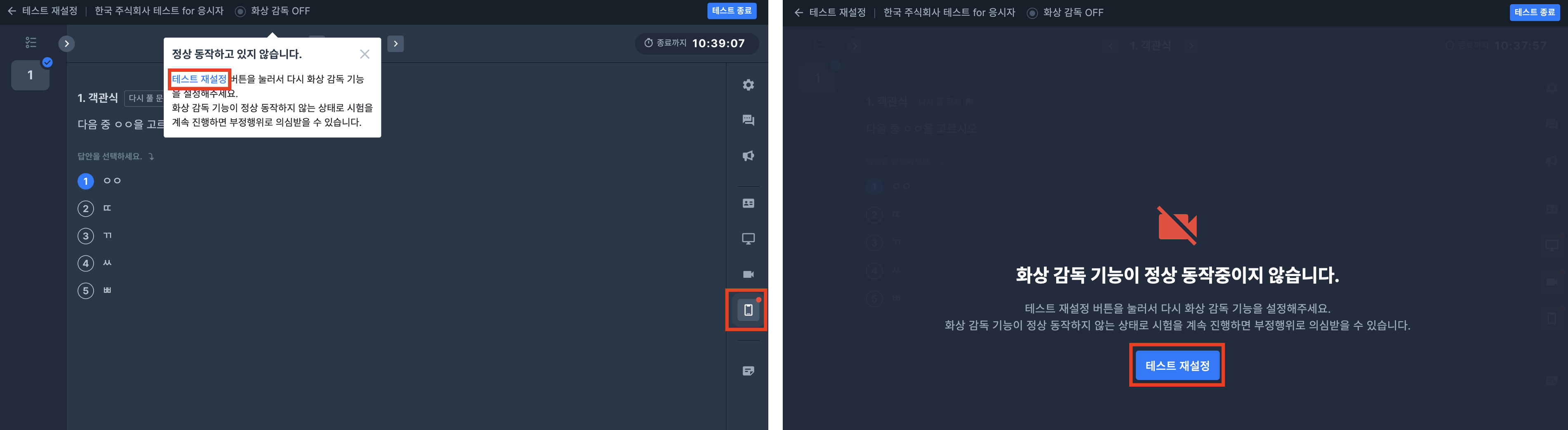 시험 중 “화상 감독 기능이 정상 작동하지 않는다"라는 메세지가 떴다는 응시자가 있는데, 어떻게 안내해야 하나요?
