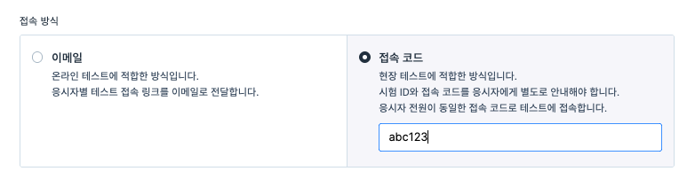 접속 코드는 테스트 생성 시 접속 방식 선택 과정에서 작성할 수 있습니다.