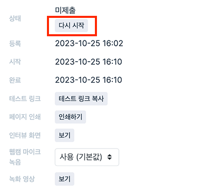 응시자 관리 페이지 왼쪽의 [다시 시작] 버튼을 클릭합니다.