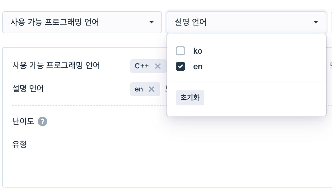테스트 생성 - 문제 선택 단계에서 설명 언어를 ‘en’ 으로 선택하면 문제 목록을 확인할 수 있습니다.