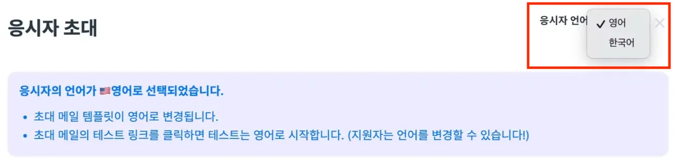응시자 초대 시 ‘응시자 언어’를 영어로 변경하여 초대할 수 있습니다.