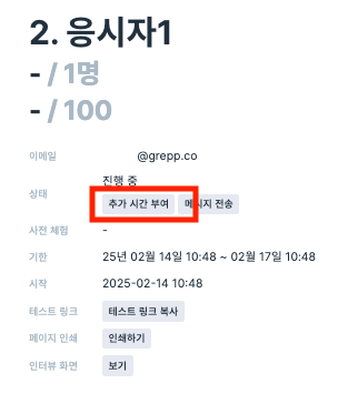 응시자가 테스트를 진행 중인 경우에만 [추가 시간 부여] 버튼이 보입니다.